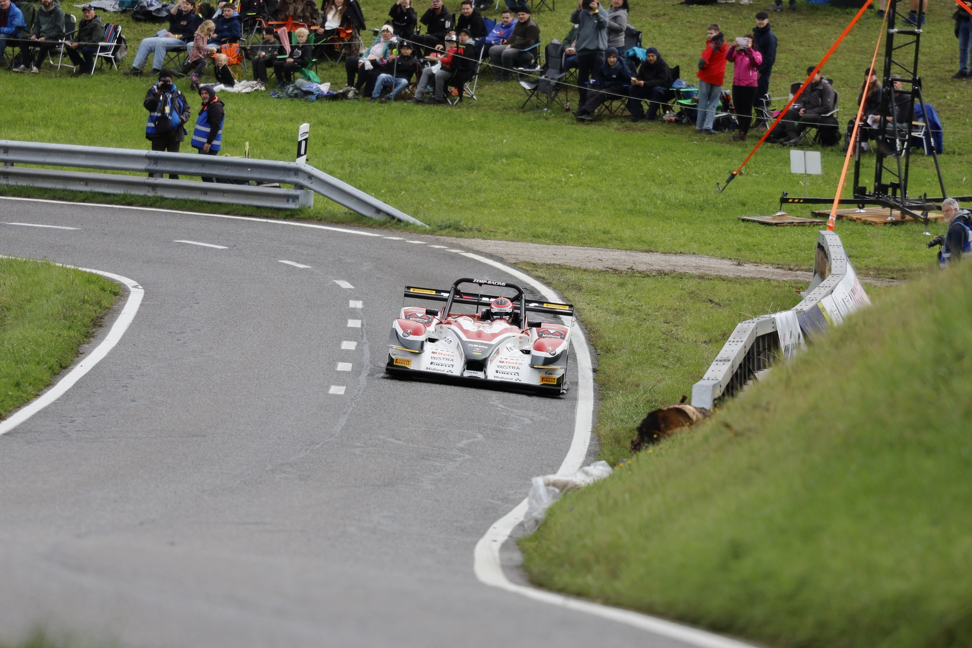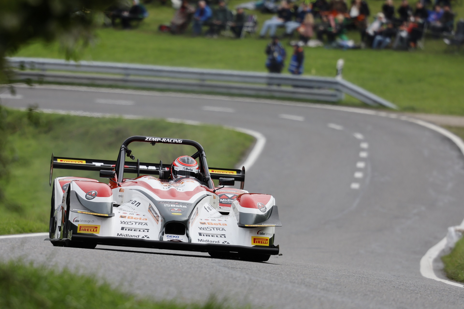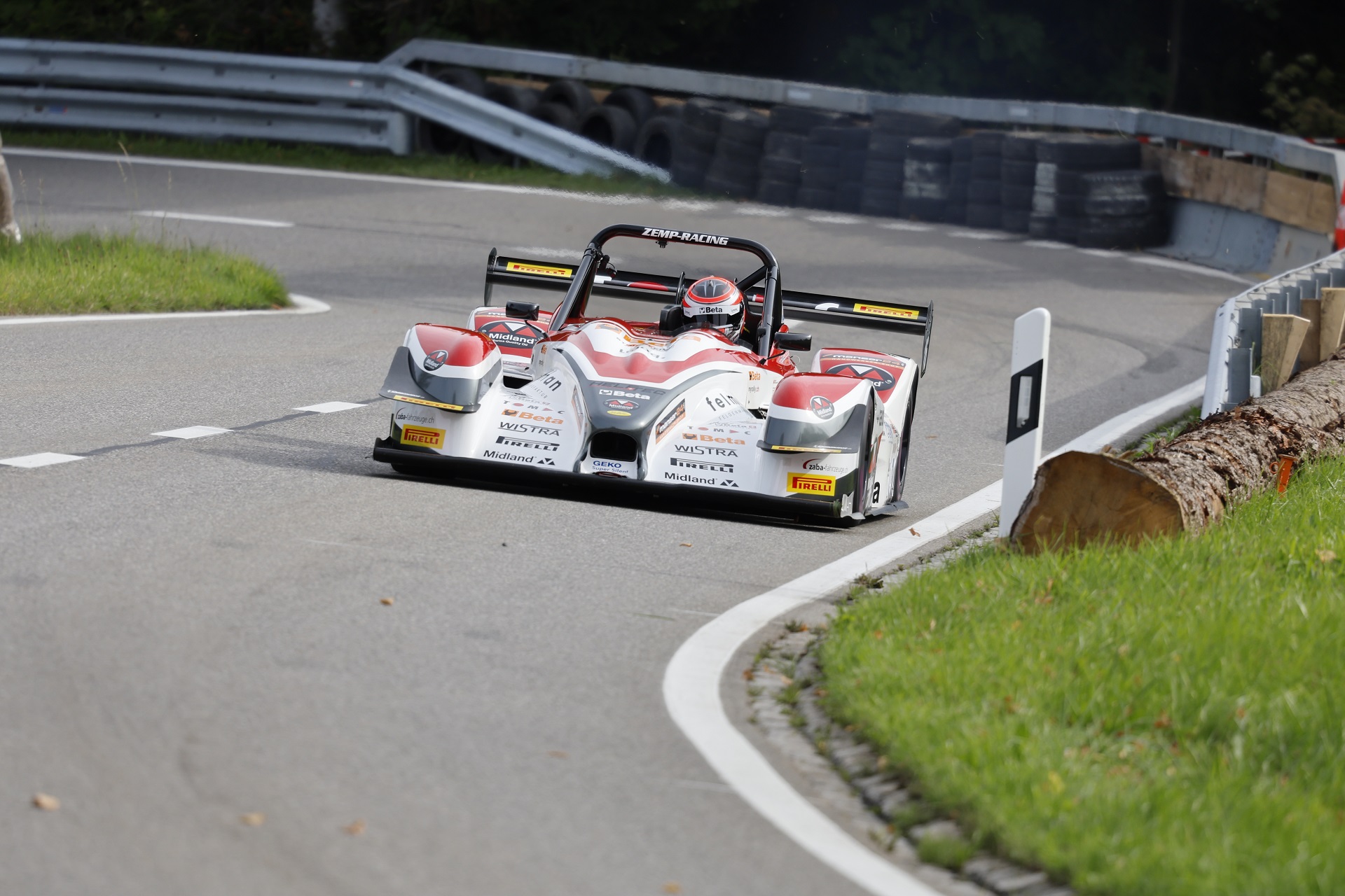 Da der Regen am Morgen aufgehört hatte und die Strecke langsam abtrocknete, hofften alle auf noch 2 Rennläufe. Die Sonne trocknete die offenen Streckenabschnitte schnell, aber in den Waldpassagen und vor allem in der 1. Kurve nach dem Start wars beim 2. Rennlauf noch feucht, beziehungsweise nass. Das bedeutete Angriff auf trockenen Abschnitten und dosieren in den nassen Abschnitten. Dies gelang mir mit 1.45.770 zu wenig gut, denn Darbellay fuhr mit 1.44.332 wieder schneller als ich. Faustini lag unerreichbar für alle an der Spitze. Amweg fuhr mit technischem Problem eine 1.46er Zeit und Steiner hatte in der ersten Kurve einen Dreher zu verzeichnen. Somit begannen wir 2 Liter Piloten Podestplätze zu schnuppern. Nur musste ich das Blatt noch umdrehen. Noch einmal bereiteten wir den Norma Helftec-Honda perfekt vor und ich konnte nach einer Fahrt ohne Fehler mit 1.44.169 mit neuem Klassenrekord die Spitze in der 2 Liter Klasse übernehmen. Sieg in der Klasse bis 2 Liter, im Scratch hinter Faustini und vor Darbellay auf Platz 2, einfach der Hammer!